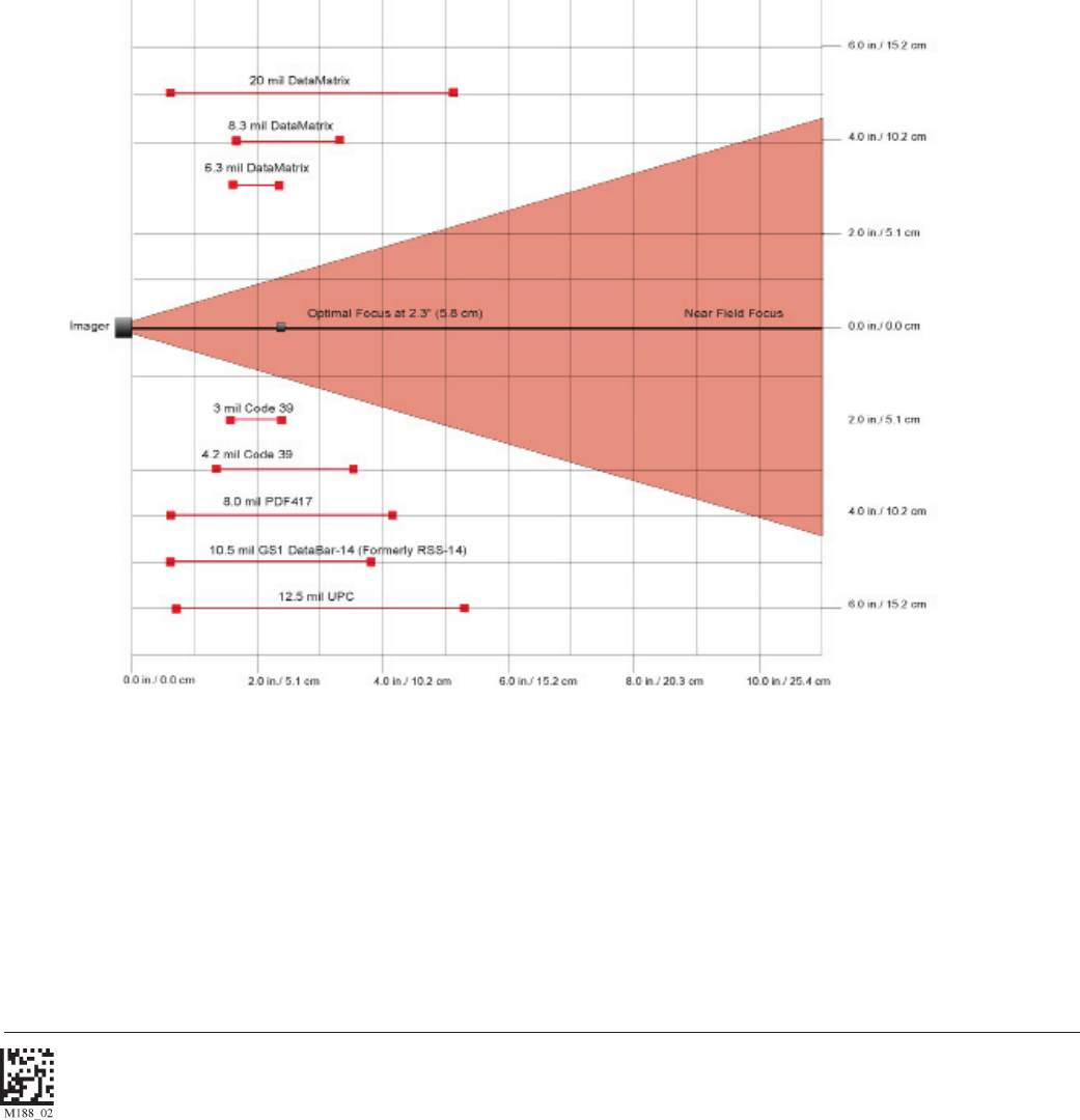 The optimal distance to read a code is 2.3.” (5.8 centimeters). The LED targeting guides projected by the CR1210 help to